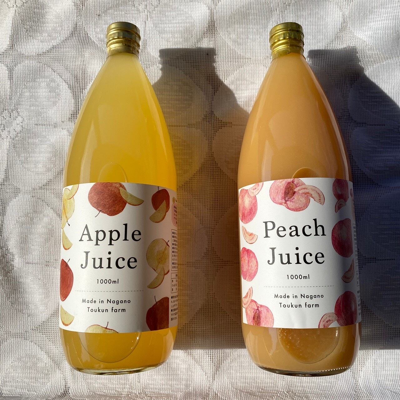 サンふじりんごを使用した100%りんごジュースと、あかつきを使用した80%桃ジュースです!